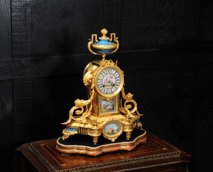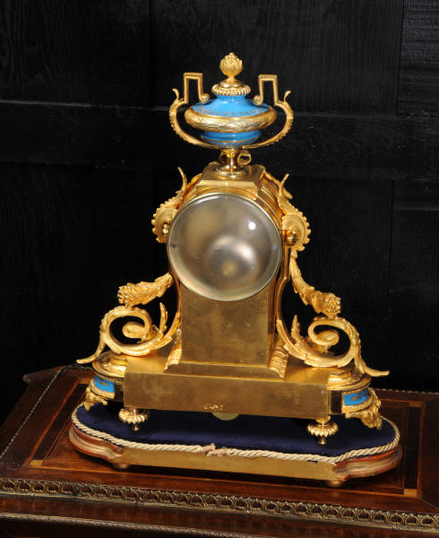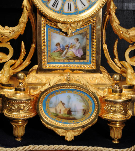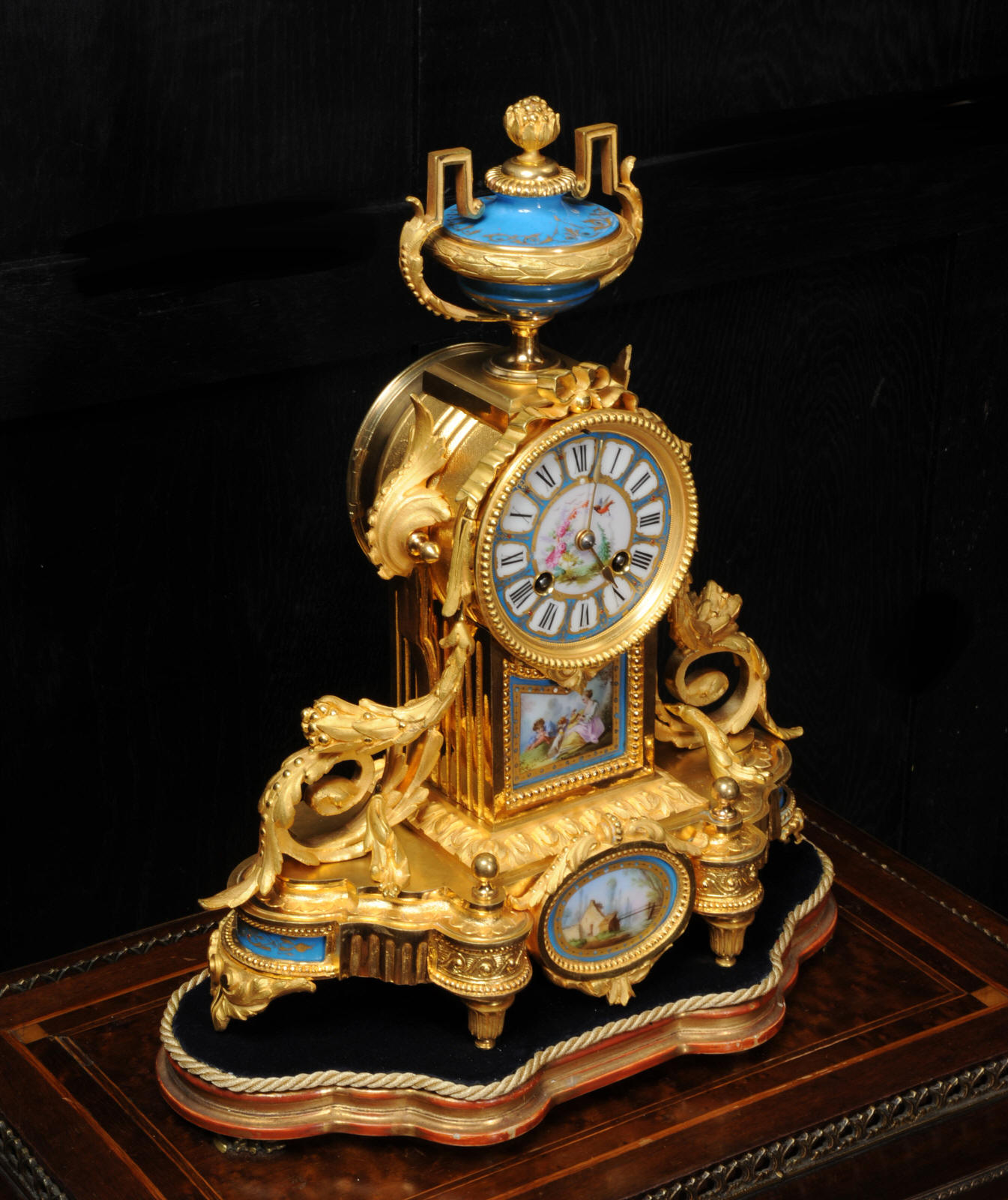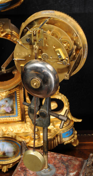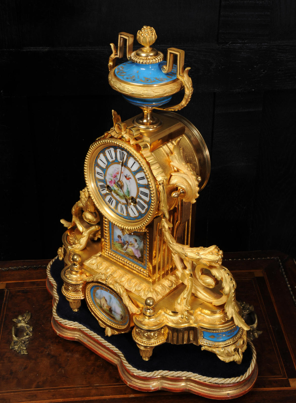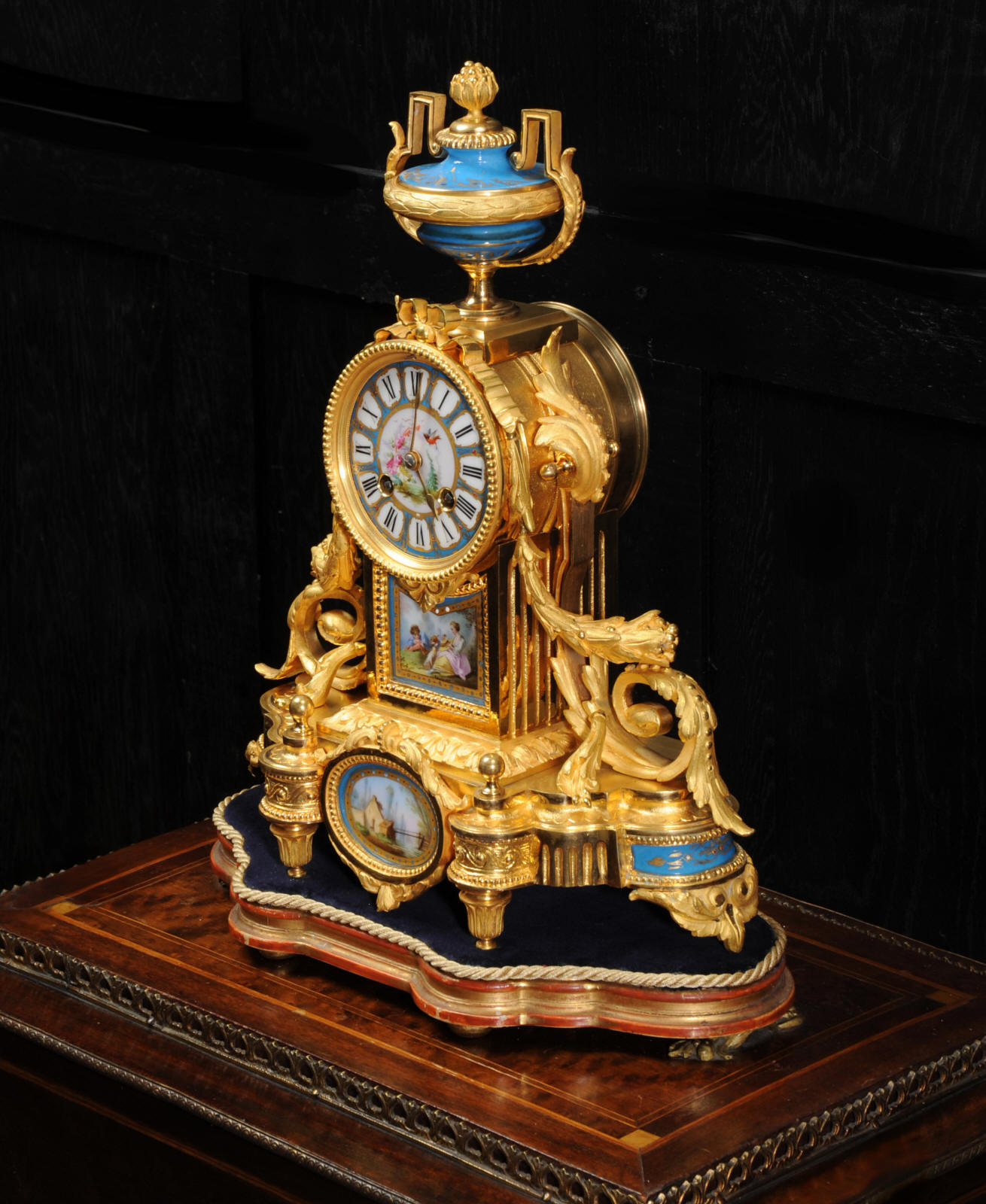 The lower porcelain panel is painted with a tranquil scene of a cottage by a river. and the dial is decorated with delicate flowers and a bird. The clock is complete with it's original gesso base. Unusually the case has the movement serial number impressed to the rear and the porcelain is signed by the artist to the rear along with the serial number. The rear door is glazed with frosted glass. The French movement is of very high quality as one would expect of Japy Freres. It has the Japy Freres 'Grande Medaille d'Honneur' mark on the movement backplate. It is in excellent clean and running condition having been fully serviced by our clockmaker. Pendulum is original. It runs for 8 days on one wind and strikes the hours and halves on a bell. Click the video clip below to hear the bell and watch the clock running! Condition of the case is excellent with a clean and bright finish, there is some very minor wear to the original gilding and some occasional discolouration. The porcelain is in excellent condition with no damage and the vast majority of the over-glaze gilt decoration present. There are losses to the red and white applied 'jewels'. Gesso base is in good condition with wear to the high spots. We have replaced the fabric. This is a fine and very decorative clock to add to your collection.