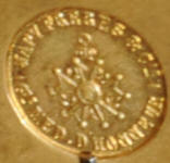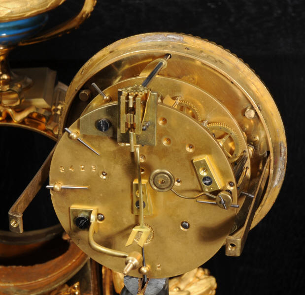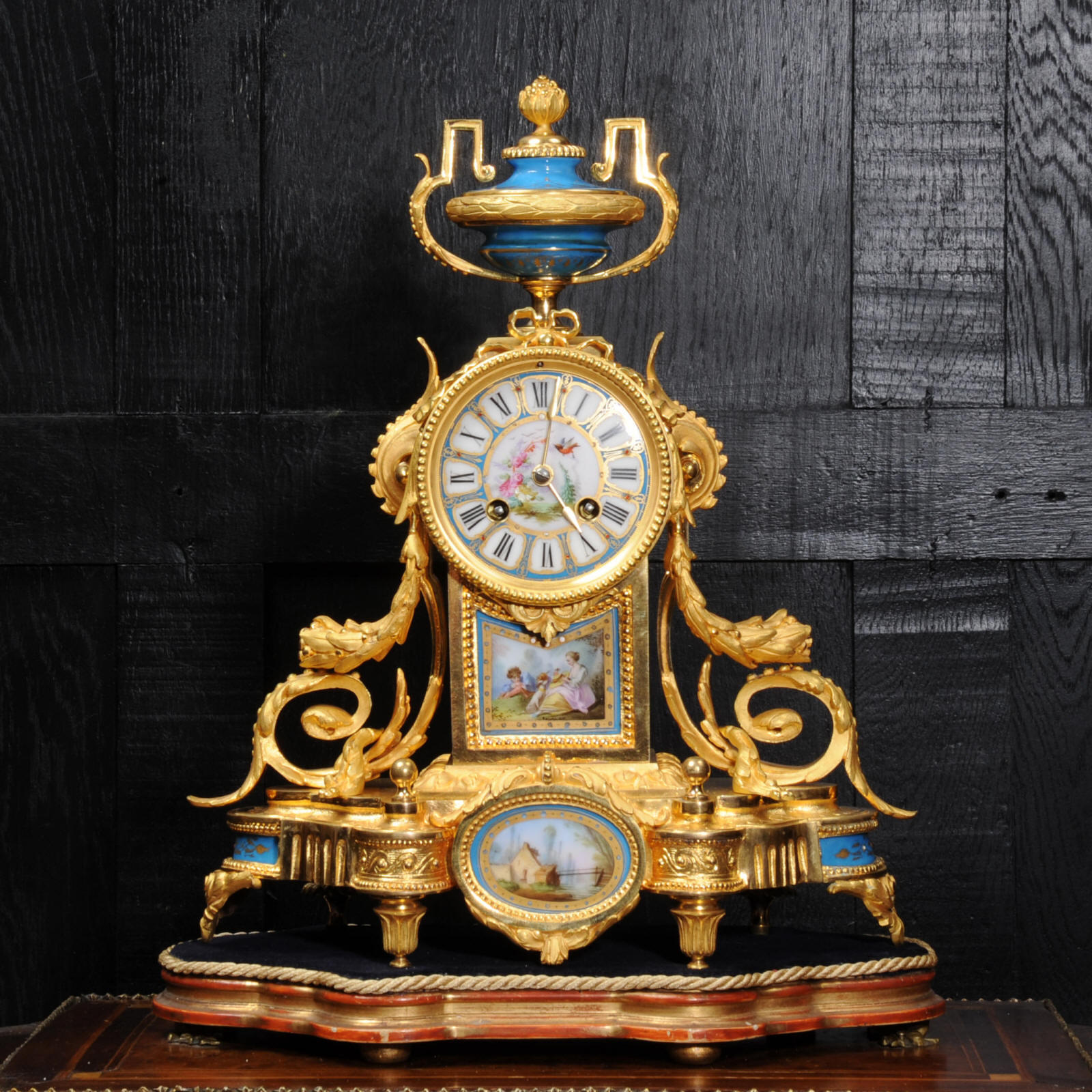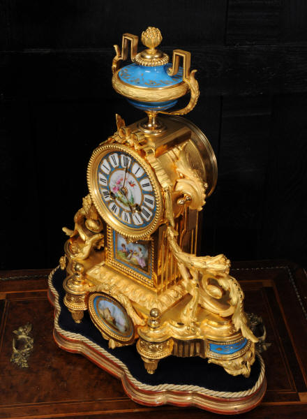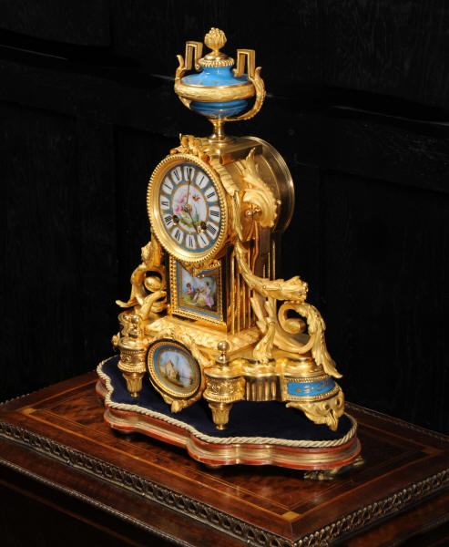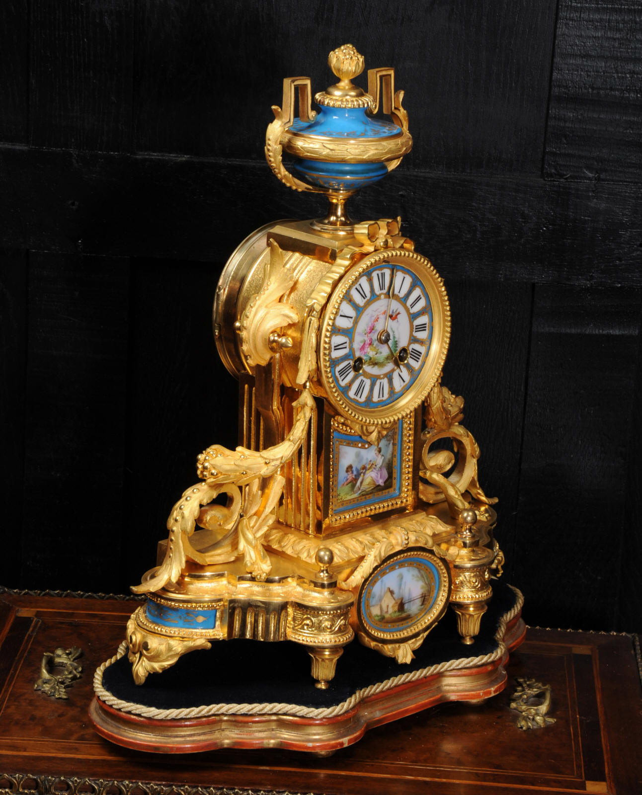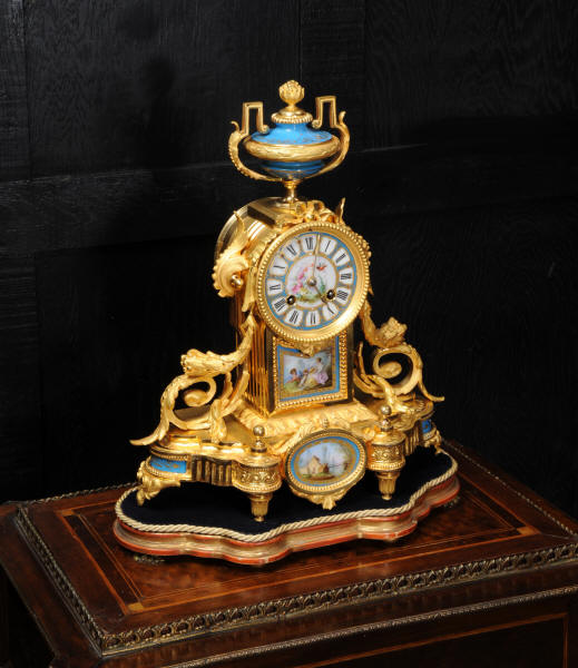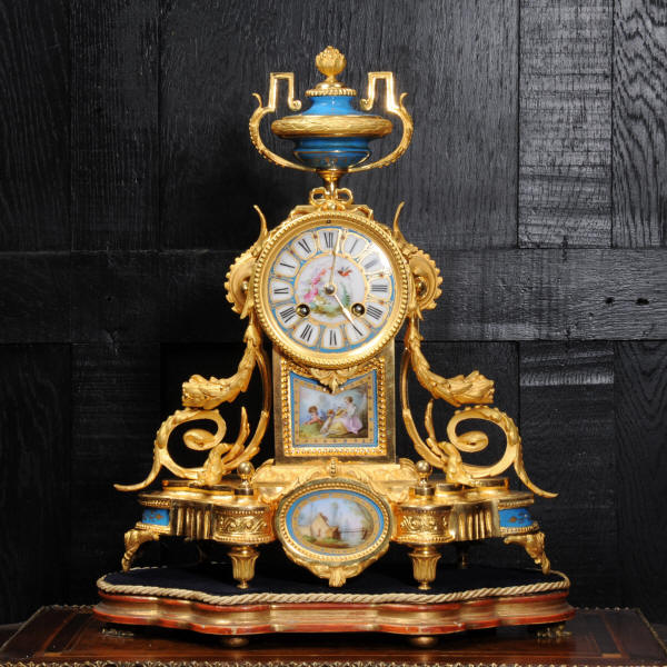 The lower porcelain panel is painted with a tranquil scene of a cottage by a river. and the dial is decorated with delicate flowers and a bird. The clock is complete with it's original gesso base. Unusually the case has the movement serial number impressed to the rear and the porcelain is signed by the artist to the rear along with the serial number. The rear door is glazed with frosted glass. The French movement is of very high quality as one would expect of Japy Freres. It has the Japy Freres 'Grande Medaille d'Honneur' mark on the movement backplate. It is in excellent clean and running condition having been fully serviced by our clockmaker. Pendulum is original. It runs for 8 days on one wind and strikes the hours and halves on a bell. Click the video clip below to hear the bell and watch the clock running! Condition of the case is excellent with a clean and bright finish, there is some very minor wear to the original gilding and some occasional discolouration. The porcelain is in excellent condition with no damage and the vast majority of the over-glaze gilt decoration present. There are losses to the red and white applied 'jewels'. Gesso base is in good condition with wear to the high spots. We have replaced the fabric. This is a fine and very decorative clock to add to your collection.