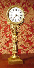 ~ Victorian ~ This is a beautiful gilt metal pillar clock in the neo-classical manner - a cherub bears the weight of the clock housed in a drum above his head - laurel wreaths and a reeded column. The capital that the cherub holds is decorated with sunflowers. The modelling of the piece is excellent. Condition is very good - as you would expect some wear to the gilt. The movement is an excellent French 8-day with platform escapement - probably a slightly later replacement for an inferior tic-tac or other small pendulum movement. The movement has been serviced and is clean and running. The hands are old replacements and the dial has been refinished to a high standard - this clock displays perfectly as you can see in the pictures below. Unusual and highly decorative addition to the home of a discerning collector Height 15 3/4", Diameter