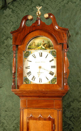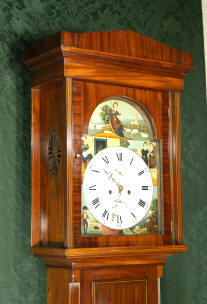 ~ Circa 1840 ~ ~~ W. M. Dickie, Paisley ~~ Excellent Condition. Tall and elegant figured mahogany case with beautiful original patina and colour, outlined with boxwood stringing. The super dial is an allegory for the ages of man, with a pretty shepherdess and flock of sheep to the arch...a real 'Little Bo-Peep' with sheep dog asleep at her side....Click here for full details! |