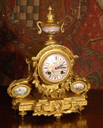 ~ Circa 1880 ~ ~~ Very good Condition ~~ Finely painted Sevrés style porcelain panels and urns set this clock apart. The porcelain has a fine delicate eau-de-nil ground in common with 18th century Sevrés porcelain.... Click here for full details! |