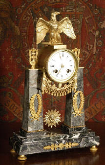 Alabaster Portico Clock Surmounted by a Lion ~ French - Circa 1860 ~ Very attractive alabaster portico clock, reminiscent of the grand tour trophies. The lion is finely carved and the dial surround, dial centre and pendulum are ormolu. Altogether a very good quality piece. |