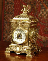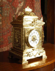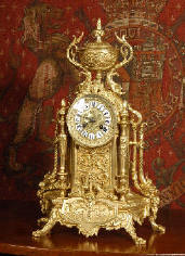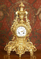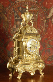 ~ French - Circa 1870 ~ ~~ Excellent condition ~~ A large and decorative Japy Freres clock, beautifully decorated with flowing floral swags, foliage and bold 'C' scrolls. The shape of the case is Rococo, with the clock mounted in a drum above a waisted base with scrolls down to the feet. Style is rather like a romantic folly, flowers and foliage and a lions mask fountain below the dial. Modelling is sharp and well detailed, case is heavily cast and is of very good quality......Click here for full details! |