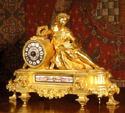 gilt clock featuring a goddess with Sevres style porcelain dial and panel. The