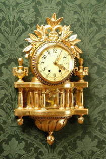 ~ Gustavian, Swedish - Vintage ~ ~~ Excellent original Condition ~~ A very decorative Gilt cartel clock - made in Sweden in the first half of the 20th century. Very good quality - the case is gesso work - plaster and wood, gilded. The high spots have worn to the red undercoat and some minor losses of gilding and plaster only add to the antique appearance. |