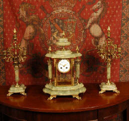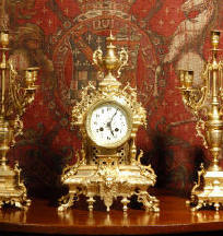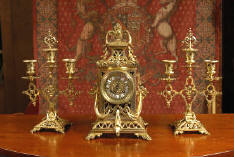 Antique French Gothic Clock Set Louis Japy ~ French - Circa 1890 ~ ~~ Excellent condition ~~ A large and decorative clock set by Louis Japy, with the original gilding in good, clean and bright condition. The clock is classical in style with a restrained architectural flavour. The candelabra have matching bases and 4 arms and are complete with a pair of snuffers. The beautiful dial is enamel on copper and is complete with the original blued steel hands.....Click here for full details! |