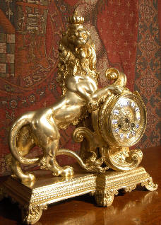 ~ French - Circa 1870 ~ ~~ Excellent condition ~~ A very large and well made French clock set with modelling of high quality in gilt brass. The style is French gothic, formed as a romantic ruin with flowing foliage, mythical creatures and hairy paw feet. The set features Lions Rampant on a shield on the front of the clock and on the vases of the candelabra. This is a large heavy and impressive clock set in lovely clean and bright condition. |