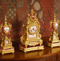 ~ French - Circa 1890 ~ ~~ Excellent condition ~~ A Very pretty French Gilt metal and porcelain clock garniture set, porcelain is a lovely plum red colour. The clock itself is surmounted by a charming pair of goddesses and a porcelain urn, the porcelain panels and the dial are beautifully painted with flowers and wild birds and the dial is signed by the London retailer.....Click here for full details! |