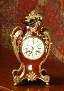 ~ French - Circa 1880 ~ ~~ Excellent condition ~~ A stunning Rococo clock of red tortoiseshell veneer and finely cast and gilded ormolu. Typically Rococo with a waisted balloon shape and asymmetric top. The tortoiseshell has a lovely rich patina and the original gilding of the ormolu is bright and clean. The superb enamel dial is complete with the original blued steel hands....Click here for full details! |