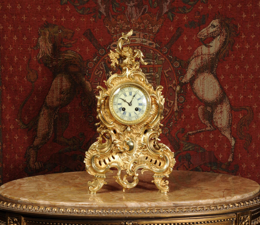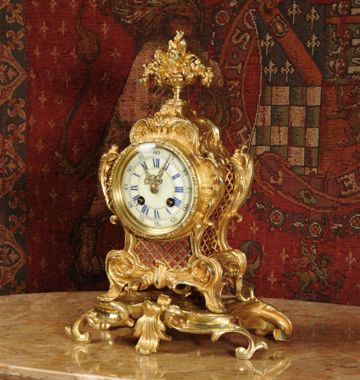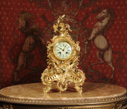 Antique Clock ~ Stunning Rococo Ormolu Boudoir Table Clock by A. D. Mougin~ French - Circa 1870 ~ ~~ Excellent condition, fully overhauled ~~ A beautiful and excellent quality original antique boudoir clock modelled in the Rococo style in ormolu. It is of waisted keyhole shape, decorated with elaborate foliate scrolls, acanthus shoulders and 'C' scrolls. To the top is a large 'urn of plenty' with flowers and fruit and it stands on its original integral base with boldly scrolling feet. ......Click here for full details! |