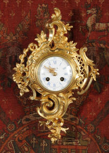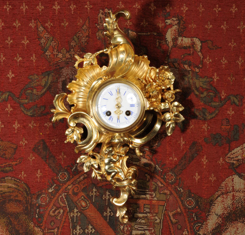 Japy Freres Rococo Cartel Clock~ French - Circa 1880 ~ ~~ Excellent condition, fully overhauled ~~ A beautiful original antique French Rococo cartel wall clock by Japy Freres. It is a delicate, asymmetric design. To one side a deeply scalloped shell and 'C' scroll to the other a beautifully depicted floral arrangement. Beneath the dial is a winged cherub playing a tune with cymbals at his feet. Behind the cherub, the pendulum can be seen swinging gently. ......Click here for full details! |
