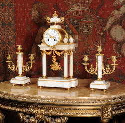Antique Clock Set ~ Ormolu and White Marble~ French - Circa 1870 ~ ~~ Excellent condition, fully overhauled ~~ A stunning classical original antique French clock set, beautifully modelled in crisp, white marble mounted with ormolu (finely gilded brass / bronze). The clock movement is held aloft in a gilded drum by 4 white marble pillars with floral swags between. The ormolu pendulum swings visibly below. ......Click here for full details! |