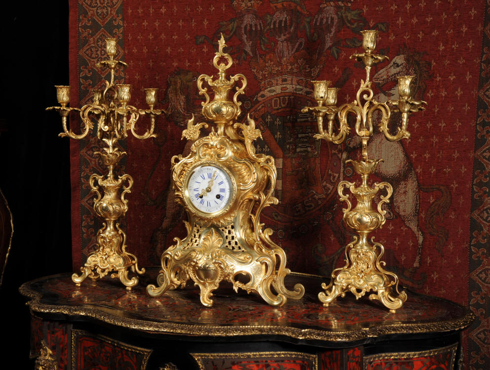 Louis Japy Large Antique French Gilt Brass Clock Set ~ French - Circa 1880 ~ ~~ Excellent condition, fully overhauled ~~ A stunning, tall and majestic original antique French Rococo clock and candelabra set. Beautiful Louis XV waisted shape with "C" scrolls, shells and floral swags. ......Click here for full details! |