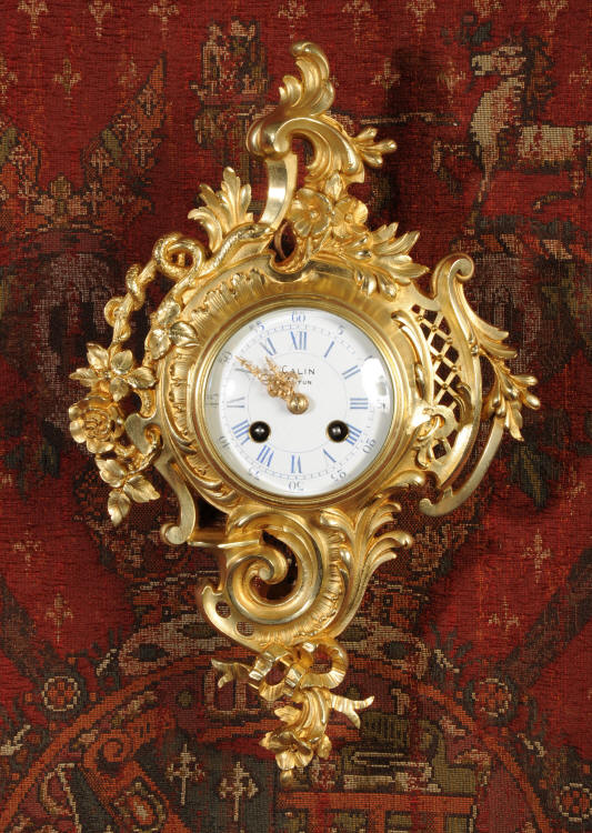 Japy Freres Rococo Cartel Clock ~ French - Circa 1870 ~ ~~ Excellent condition, fully overhauled ~~ A beautiful original antique French Rococo cartel wall clock by Japy Freres. It is a delicate, asymmetric design. To one side is a scroll with a fretted panel and to the other a floral swag with a snake entwined around a branch. An acanthus scroll sits on the top of the clock and a bold 'C' scroll beneath the dial with a ribbon and bow. Behind the 'C' scroll, the pendulum can be seen swinging gently. This is very well made clock with sharp detail and a bright finish. ......Click here for full details! |