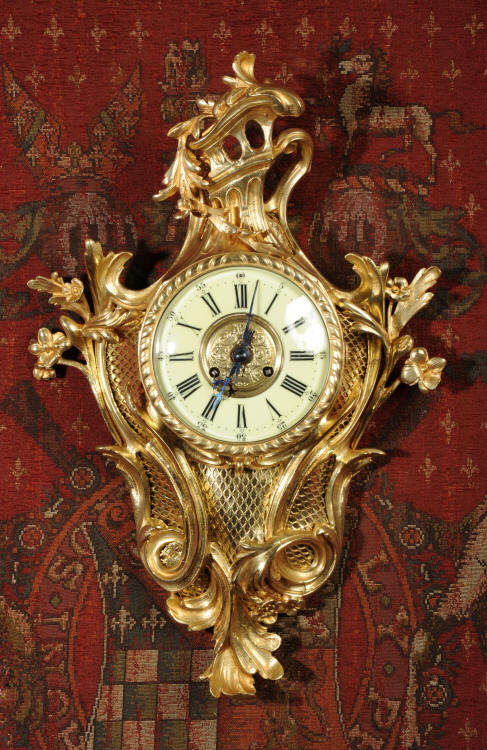 Rococo Cartel Wall Clock ~ French - Circa 1870 ~ ~~ Excellent condition, fully overhauled ~~ A large, bold and stunning original antique French brass Rococo cartel clock, classic Rococo asymmetrical shape with bold and flamboyant scrolls and foliage. It is beautifully modelled in gilt brass, scrolling foliage forms the case, backed with fretwork backed with gilded brass. To the shoulders are leaves and flowers and an ornate finial sits on the top. The superb large dial is enamel on copper with a brass centre and is complete with original blued steel hands and convex bevelled glass. ......Click here for full details! |