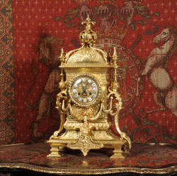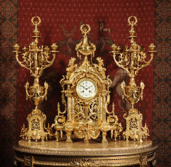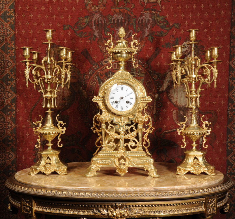 Antique Clocks ~ Huge Antique French Gilt Brass Clock Set~ French - Circa 1890 ~ ~~ Excellent condition, fully overhauled ~~ A very large and impressive original antique French gilt brass clock set, standing at 30" in height. It is Louis XVI style and features an elaborate fretted panel to the front. It is architectural in style, Corinthian columns to each side, scrolls and acanthus leaves and swags and bows. Candelabra are conforming in style with large classical handled urns ......Click here for full details! |