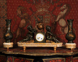 Antique Clock Set ~ Bacchus Themed Putti~ French - Circa 1890 ~ ~~ Excellent condition, fully overhauled ~~ A stunning original antique French clock set, Bacchus themed with two charmingly depicted putti or cherubs, the little boy holding grapes and the little girl holding a sheave of wheat. They are beautifully modelled and finely finished in bronze patinated metal which has a lovely deep green / brown colour. The bases are sienna marble, lovely pinkish off white with a strong orange figure running through it ......Click here for full details! |