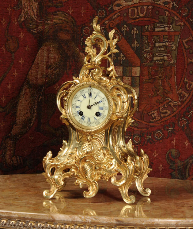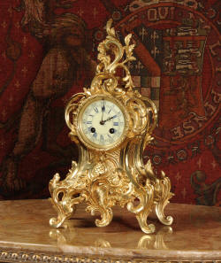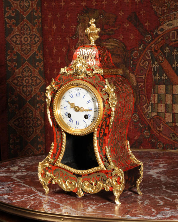 Antique French Boulle Boudoir Clock ~ French - Circa 1880 ~ ~~ Excellent condition, fully overhauled ~~ A beautiful original antique French boudoir clock of Boulle work in the Rococo style. The case is of waisted keyhole shape, veneered in red shell veneer, delicately inlaid with polished brass. It is mounted with fine ormolu, C scrolls, acanthus and a goddess mask. To the top is a Rococo urn. The front of the clock is glazed to allow the pendulum to be seen swinging within the case. The red shell veneer has mellowed to a lovely antique red-brown with plenty of character. ......Click here for full details! |