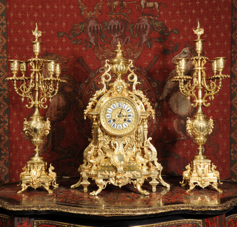Early Antique French Brass Clock~ French - Circa 1860 ~ ~~ Excellent condition, fully overhauled ~~ A large and earlier antique French brass clock set. It is a beautifully bold baroque design with mythical creatures and lions masks. The front of the case is elaborately fretted to allow the pendulum to be seen swinging within the case. The the top of the clock is a large handled urn with a pineapple finial. Candelabra are conforming in style with branches incorporating mythical creatures and masks. ......Click here for full details! |