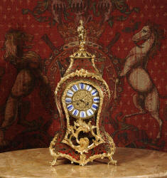 Fine Antique French Boulle Bracket Clock by Japy Freres~ French - Circa 1880 ~ ~~ Excellent condition, fully overhauled ~~ An exquisite and large original antique bracket clock, Louis XV style, veneered in Boulle work and mounted with ormolu (fine gilded bronze). This clock is of the most superb quality and finish, the red veneer has mellowed to a beautiful antique red-brown and the combination of the red veneer, brass inlay and ormolu produces the most sumptuous effect. The case is glazed to three sides to allow the ormolu sunburst pendulum to be seen swinging. ......Click here for full details! |