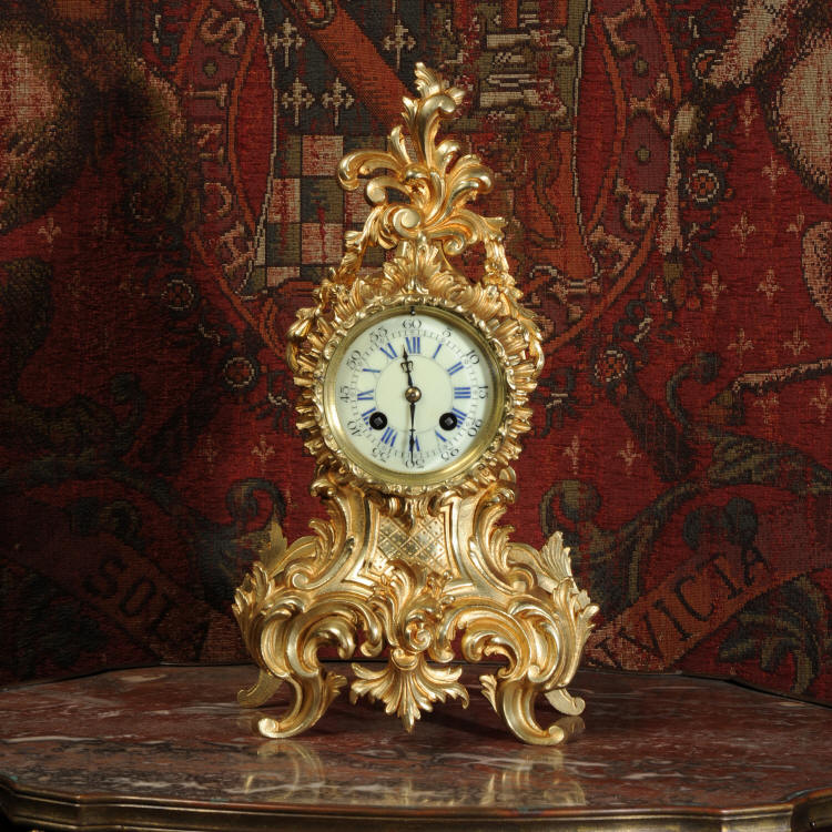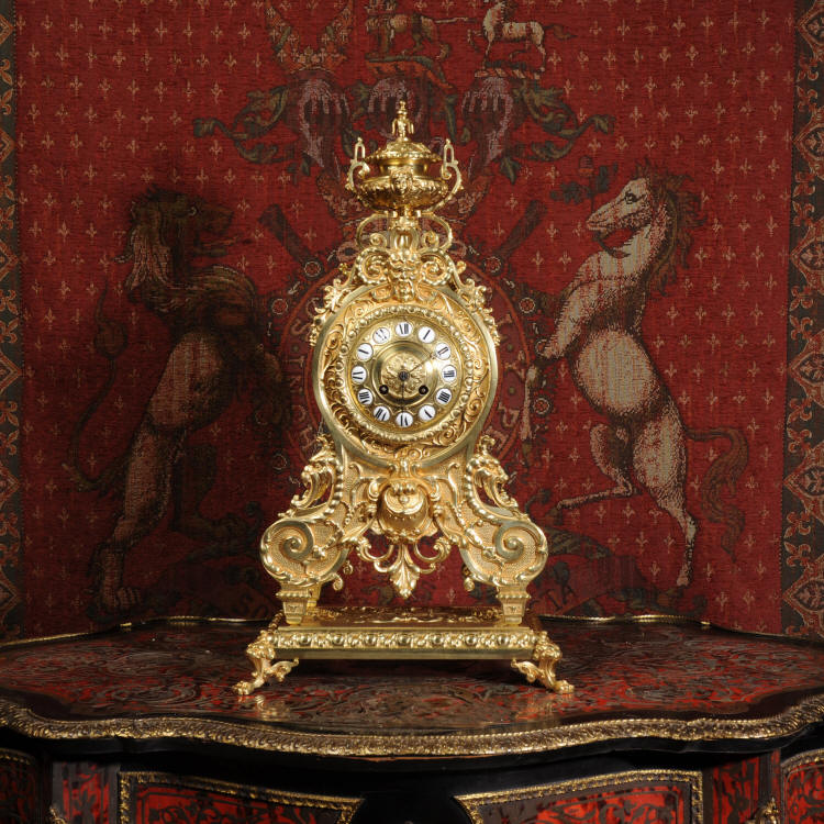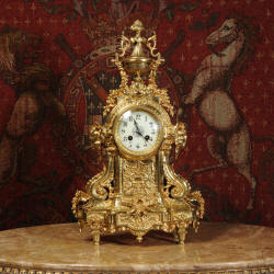 Large Gilt Bronze Table Clock~ French - Circa 1880 ~ ~~ Excellent condition, fully restored ~~ A very large and magnificent original antique French Baroque table clock, beautifully made in ormolu or gilt Bronze. The movement is housed in a drum supported upon outswept scrolls with mythical creatures that sit upon the integral base. Height 22 1/2", 57.5 cm. ......Click here for full details! |