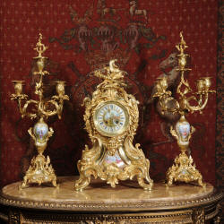 Large and Superb Porcelain and Ormolu Clock Set, A. D. Mougin~ French - Circa 1900 ~ ~~ Excellent condition, fully restored ~~ A large and stunning Ormolu (gilt bronze) clock set mounted with exquisite Sèvres style porcelain. It is Rococo in style, a bold balloon shape with sweeping 'C' scrolls, floral swags, dolphins and a flaming torche to the finial. The delicately painted panel to the front shows a charming scene of a young man serenading a lady in a country setting. ......Click here for full details! |