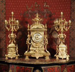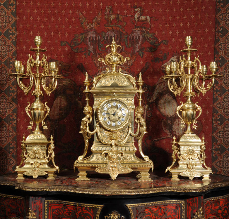 Huge Antique French Gilt Brass Clock Set~ French - Circa 1870 ~ ~~ Excellent condition, fully overhauled ~~ This is a very large and heavy original antique French brass clock set. It is very decorative in the classical style, beautifully, modelled and finished. To each side is a Caryatid, supporting the cavetto cornice upon her head. Below the dial is a lions mask holding a swag within its mouth. Candelabra are conforming in style with matching bases with handled urns above. RSC2356 ......Click here for full details! |