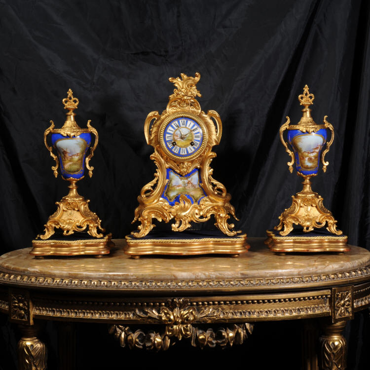 Stunning Sevres Porcelain Mounted Gilt Metal Rococo Clock Set~ French - Circa 1880 ~ ~~ Excellent condition, fully overhauled ~~ A stunning original antique French clock set featuring exquisitely painted Sevres style porcelain urns and panels. They depict beautifully tranquil country scenes against a rich royal blue ground with delicately painted over-glaze gilt decoration. ......Click here for full details! |