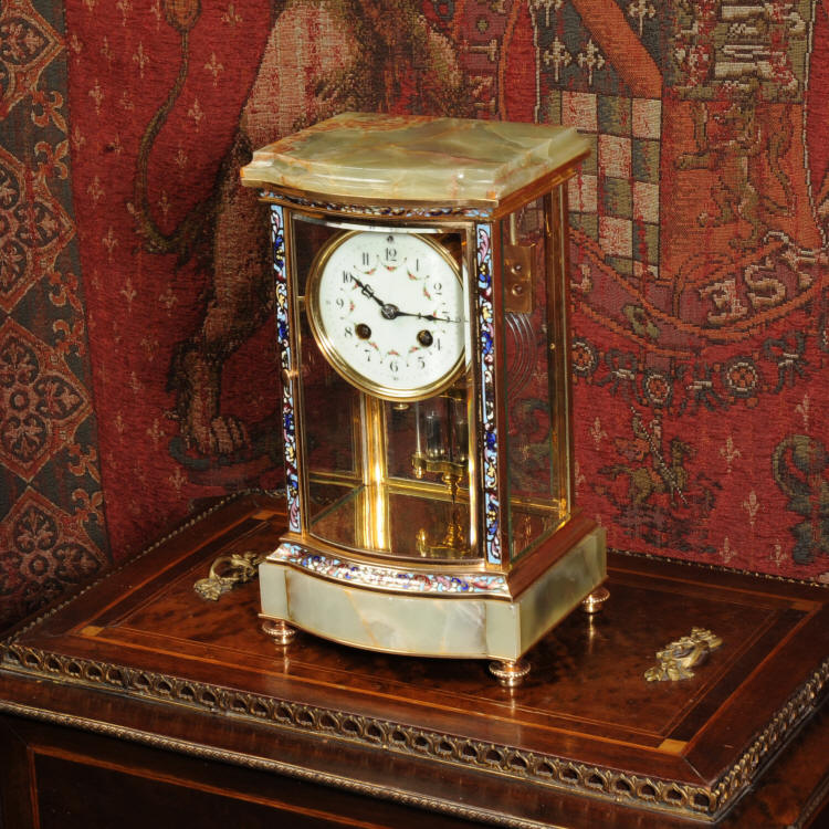 Bow Front Cloisonné Enamel, Ormolu and Onyx Four Glass Regulator~ French - Circa 1900 ~ ~~ Excellent condition, fully overhauled ~~ A very chic antique French library four glass crystal regulator with Cloisonné or Champlevé enamel decoration to the front along with bow front glass. The four sides are glazed with beveled glass to allow the mercury compensated pendulum to be seen gently swinging and the fastidiously restored movement to be seen functioning. Height 11 1/2" or 29 cm. ......Click here for full details! |