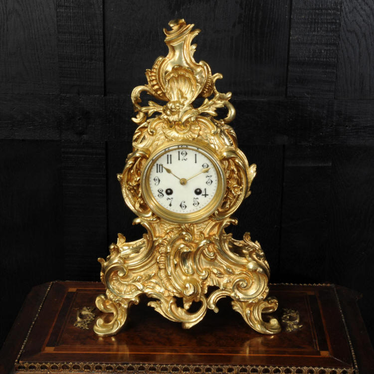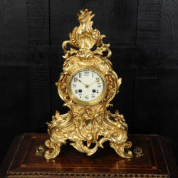 Antique French Gilt Bronze Rococo Clock~ French - Circa 1900 ~ ~~ Excellent condition, fully overhauled ~~ A very decorative Rococo clock, beautifully and heavily modelled in gilded bronze. It is of classic Rococo waisted keyhole shape, decorated with scrolls, flowing foliage and a shell motif. The dial is porcelain enamel on copper with original brass hands. ......Click here for full details! |