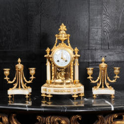 Ormolu and Marble Clock Set by Samuel Marti~ French - Circa 1880 ~ ~~ Excellent condition, fully overhauled ~~ A fine and elegant original antique French Louis XVI style clock set. It is beautifully made of cream marble mounted with very good quality ormolu (finely gilded bronze) which is in excellent condition. The front has a curved and beveled glass panel to allow the ormolu sunburst pendulum to be seen gently swinging within the gilded interior of the case. ......Click here for full details! |
