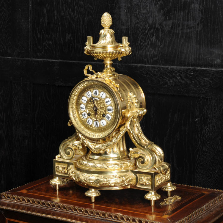 Superb Neoclassical Drum Head Clock by Richond Paris~ French - Circa 1870 ~ ~~ Excellent condition, fully overhauled ~~ A stunning original antique French clock of Neoclassical design in gilded bronze. The movement is mounted in a drum on top of a reeded column. Scroll supports are to the sides and a laurel swag is draped below the dial. Above the dial is a delicate bow and an urn with pineapple finial. Height 16" ......Click here for full details! |