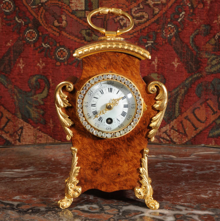 Miniature Antique French Boudoir Clock~ French - Circa 1910 ~ ~~ Excellent condition, fully working ~~ A beautifully delicate miniature boudoir clock, an original antique French timepiece in the Rococo style. The case is burr walnut mounted with exquisitely finished ormolu mounts. Acanthus swags to the shoulders and feet and a gadrooned border to the stop with a pretty loop handle. The bezel is set with jewels that glint as they catch the light and the lovely little dial is enamel on copper and complete with original fine gilt brass hands. Height 7 1/2" or 19 cm. ......Click here for full details! |