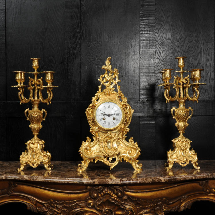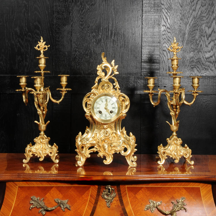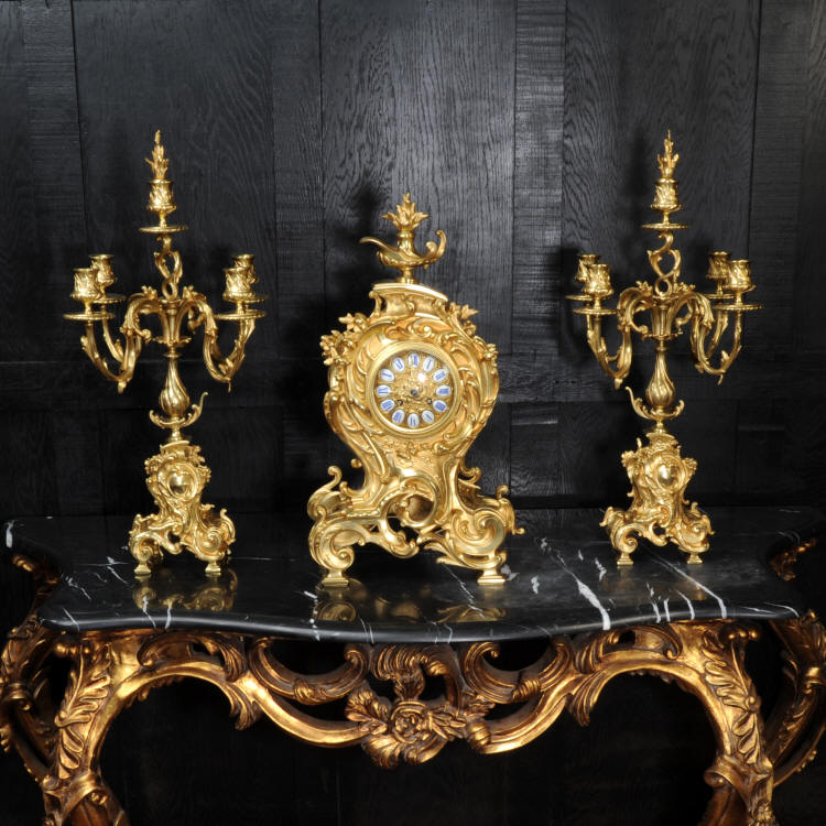 Large Antique French Rococo Gilt Bronze Clock Set~ French - Circa 1870 ~ ~~ Excellent condition, fully overhauled ~~ A stunning and large original antique French gilded bronze clock set. It is of the most beautiful Rococo style, waisted case decorated with 'C' scrolls, acanthus leaves and floral swags. Candelabra have 4 elaborate acanthus arms held aloft on asymmetric urns with conforming bases. ......Click here for full details! |