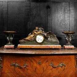 Art Deco Clock Set ~ Leda and the Swan by Pierre Sega~ French - Circa 1925 ~ ~~ Excellent condition, fully overhauled ~~ A most beautiful clock set depicting the Greek myth of Leda and the Swan by the well known sculptor Pierre Sega. Leda holds the swan in her arms with his wing wrapped around her. The side pieces are tazzas with stems supported by swans. It is finely modelled in patinated white metal. A beautiful red and orange specimen marble is used for the bases along with a contrasting white veined marble. ......Click here for full details! |