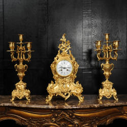 Japy Freres Large Rococo Clock Set~ French - Circa 1890 ~ ~~ Excellent condition, fully overhauled ~~ A large and stunning antique French gilt bronze clock set by Japy Freres. It is Rococo in style, a bold, asymmetric balloon shape profusely decorated with acanthus and floral swags. To the top is a flaming finial, the candelabra have flaming snuffers to match. The design is beautifully bold, heavy and flowing. ......Click here for full details! |