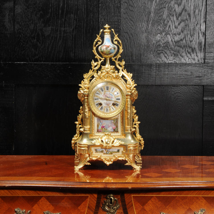 Japy Frères Ormolu and Sèvres Porcelain Clock~ French - Circa 1890 ~ ~~ Excellent condition, fully overhauled ~~ A stunning original antique French clock by the famous maker Japy Frères. It is Louis XVI in style, mounted with exquisite Sèvres style porcelain. This has a cream ground delicately painted a scene of a young couple. The lower panel and the urn finial also have beautifully painted country scenes. ......Click here for full details! |
