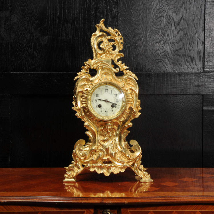 Antique French Gilt Bronze Rococo Clock ~ Neptune and the Sea~ French - Circa 1890 ~ ~~ Excellent condition, fully overhauled ~~ A lovely antique French clock, boldly modelled in the Rococo style in gilded bronze. A mask of Neptune just below the dial sits in the midst of a spectacular boiling sea that forms the lower part of the case. Dolphins riding the surf form the feet of the clock. The top of the case is decorated with decorated with 'C' scrolls, bold scrolls and to the top is an elaborate asymmetric finial decorated with trailing foliage. ......Click here for full details! |