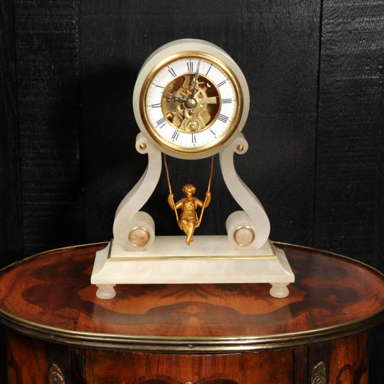 Rare Eugéne Farcot Maiden On A Swing Boudoir Clock~ French - Circa 1870 ~ ~~ Excellent condition, fully overhauled ~~ A super, rare original antique French clock featuring a maiden swinging back and forth as the pendulum. This is the Farcot version, the best one, patented by Farcot in 1862. It uses a double escapement with a half moon pallet to achieve the front to back motion for the cherub. The front plate of the movement is skeletonised and is visible through the centre of the dial. ......Click here for full details! |