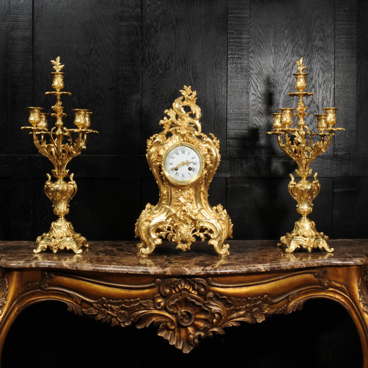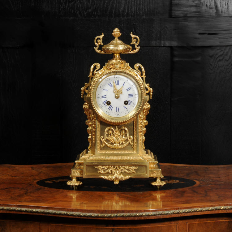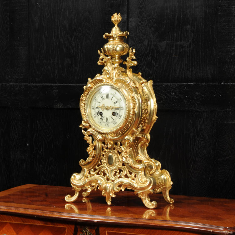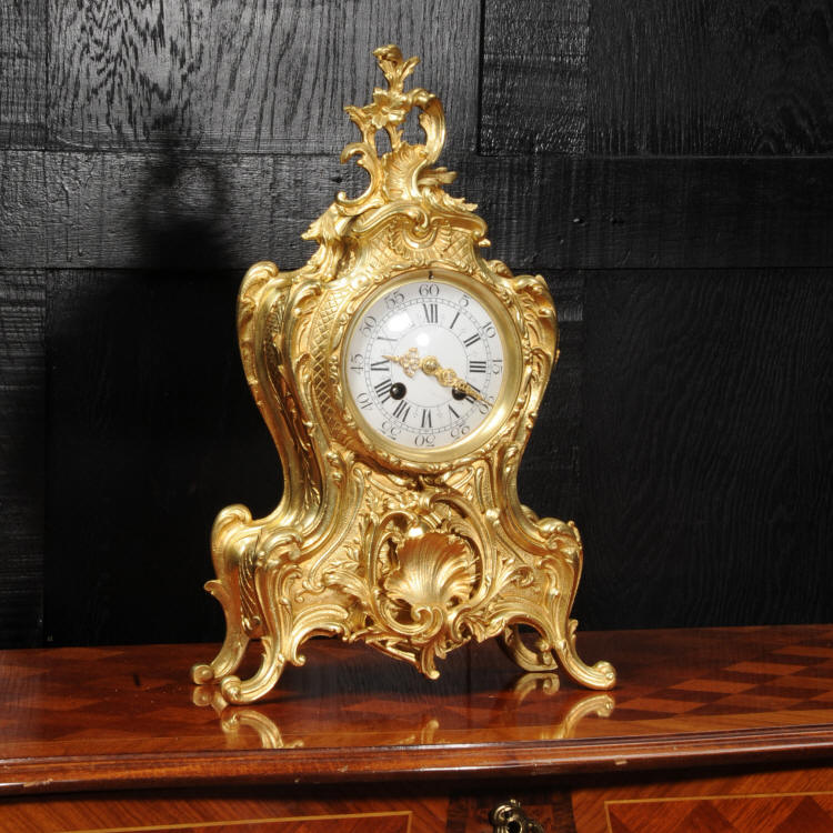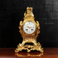 Antique French Ormolu Louis XV Rococo Clock~ French - Circa 1880 ~ ~~ Excellent condition, fully overhauled ~~ A stunning antique French ormolu Rococo clock. It is beautifully modelled in the Rococo style of Louis XV in Ormolu (gilded bronze). Beautiful balloon shaped case with acanthus to the shoulders and a Rococo flourish to the top. Sound frets are fitted to the front and sides. It stands on it's original integral base with boldly scrolling feet. A reflection of the pendulum swinging can be just seen in the highly polished centre of the base. ......Click here for full details! |