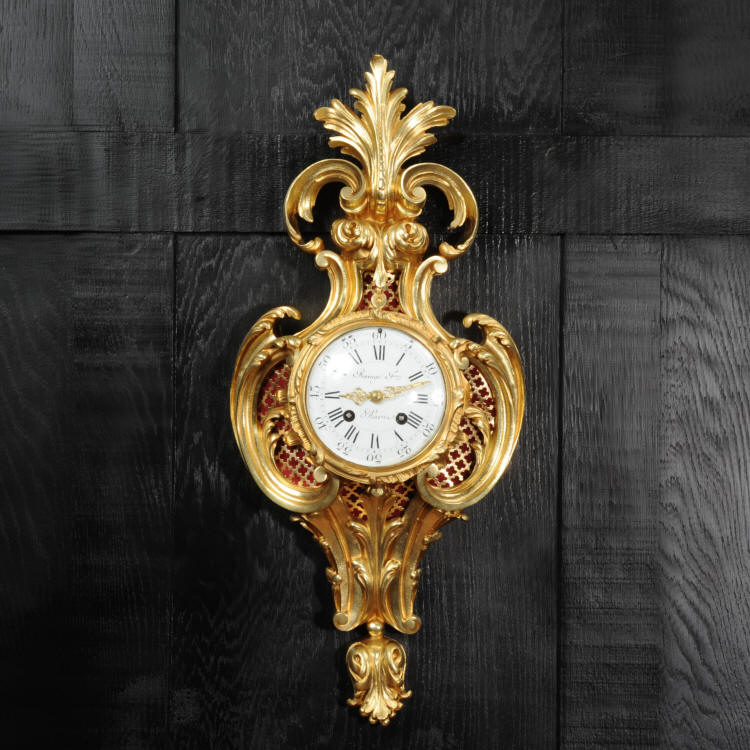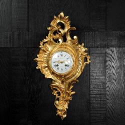 Raingo Frères Louis XV Rococo Gilt Bronze Cartel Wall Clock~ French - Circa 1880 ~ ~~ Excellent condition, fully overhauled ~~ A stunning original antique French cartel wall clock by the famous Parisian maker Raingo Frères with the movement by Japy Frères. It is Louis XV in style, the Rococo case formed of sweeping 'C' scrolls and acanthus. It is heavily modelled in bronze with a fine gilt finish. ......Click here for full details! |