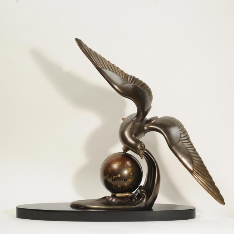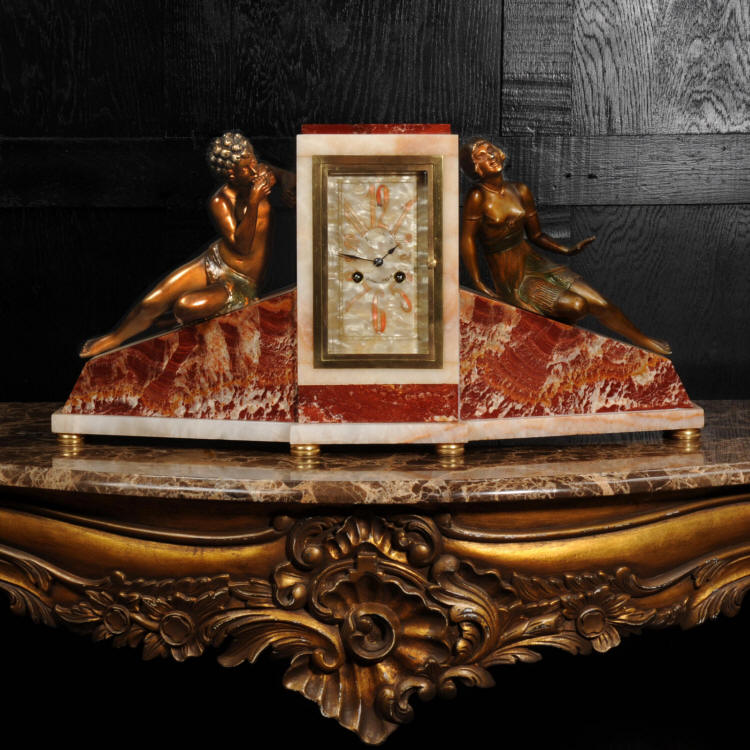Art Deco Clock - Music and Love by Ferdinand Verger~ French - Circa 1925 ~ ~~ Excellent condition, fully overhauled ~~ A stunning Art Deco clock featuring a young couple, he serenades her with a tune on the pipes, she listens from the other side of the clock. The clock is made of two beautiful specimen marbles, a highly figured red and subtly figured off white. The dial is faux mother-of-pearl, a signature style of Ferdinand Verger ......Click here for full details! |