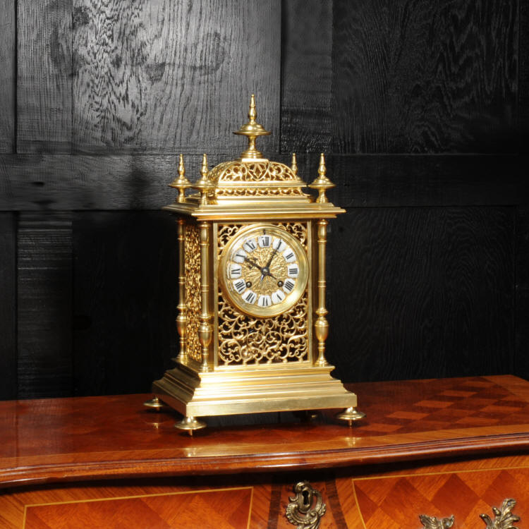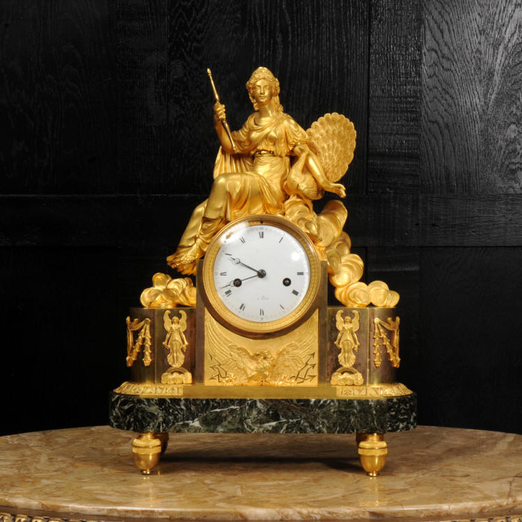Ormolu Drum Head Clock with Lions Masks~ French - Circa 1860 ~ ~~ Excellent condition, fully overhauled ~~ A fine and early original antique French drum head clock. Beautifully made in finely gilded bronze, It is of Neoclassical design with lions masks, scrolling acanthus supports and a classical urn to the top with flame finial. Pierced panels to the four sides allow the pendulum to be seen gently swinging within. The movement is by Samuel Marti. ......Click here for full details! |