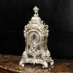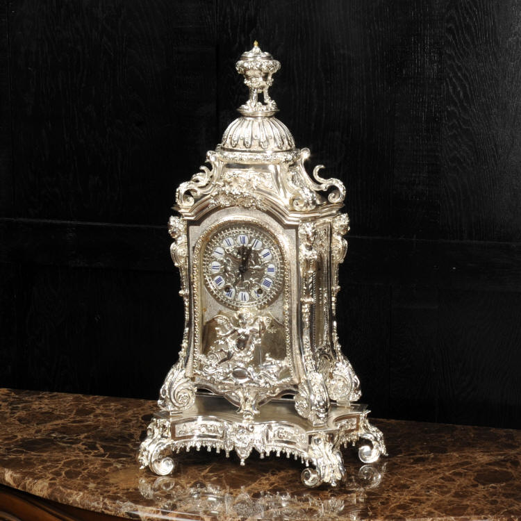 Spectacular Louis XIV style Silvered Bronze Bracket Clock~ French - Circa 1880 ~ ~~ Excellent condition, fully overhauled ~~ A rare and spectacular antique French bracket clock. Finely modelled in the Louis XIV style in silver plated bronze. Beautifully proportioned with an glazed arched door with a cherub mount, cantered corners with finely modelled goddess caryatids sitting on bold, scrolling, acanthus feet. The sides are glazed with arched openings allowing the silver pendulum to be seen swinging inside. ......Click here for full details! |