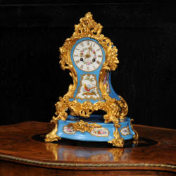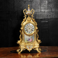 Sèvres Porcelain and Gilt Bronze Clock~ French - Circa 1900 ~ ~~ Excellent condition, fully overhauled ~~ A large and stunning original antique French clock. It is Louis XV in style, mounted with exquisite Sèvres style porcelain with a cream ground. Below the dial is a panel depicting a couple strolling in a country setting. To the top is a gadrooned urn, delicately painted with floral garlands. ......Click here for full details! |