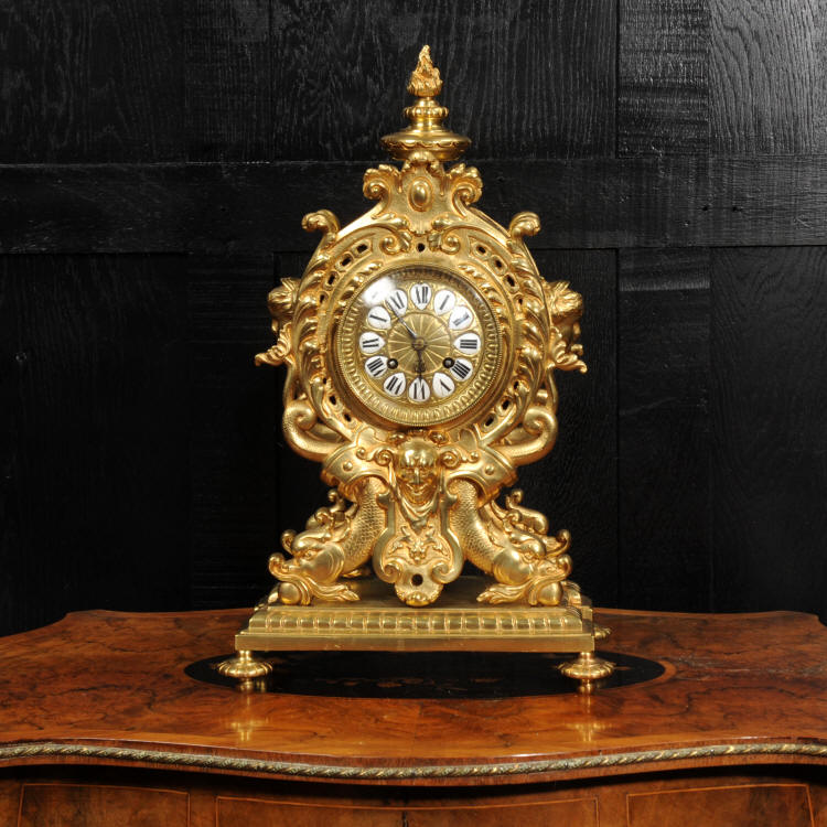 Antique French Gilt Bronze Baroque Clock~ French - Circa 1880 ~ ~~ Excellent condition, fully overhauled ~~ A large and stunning antique French Baroque drum head clock. Beautifully modelled in gilt bronze, the clock sits upon a a cushion shaped base with mythical creatures forming the feet. A swept gadrooned support holds the clock in a drum with elaborate scrolling acanthus to the sides. ......Click here for full details! |