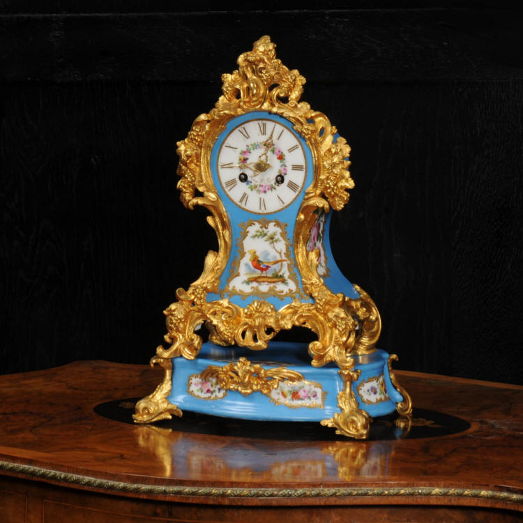 Antique French Ormolu and Porcelain Clock~ French - Circa 1855 ~ ~~ Excellent condition, fully overhauled ~~ A lovely, early ormolu (finely gilded bronze) Gothic clock mounted with exquisite porcelain panels with a royal blue ground. These are beautifully decorated with heraldic motifs. The dial has a portrait of a royal couple and to the front of the clock is a seated knight in armor. Brackets to the side of the clock feature gothic goygoyls and above the dial is an angelic mask. The original gilding is beautifully crisp and fresh. ......Click here for full details! |