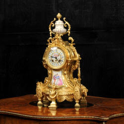 Japy Frères Ormolu and Sevres Porcelain Clock~ French - Circa 1880 ~ ~~ Excellent condition, fully overhauled ~~ A stunning original antique French boudoir clock by the renown maker Japy Frères. It is made of exquisite ormolu (finely gilded bronze) mounted with delicately painted Sèvres style porcelain. The Porcelain is decorated with a pompadour rose pink background, the panel below the dial is delicately painted with cherubs. ......Click here for full details! |