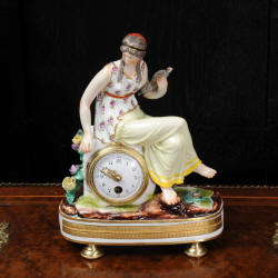 Rare Vienna Porcelain Boudoir Clock~ Circa 1880 ~ ~~ Excellent condition, fully overhauled ~~ A beautiful Royal Vienna type porcelain boudoir clock featuring a classical maiden seated on a rock. She is holding a dove and is surrounded by delicate flowers. The tiny French movement is mounted in the rock and has an enamel on copper dial with very fine gilt brass hands. This superb little clock would be ideal for a desk or dressing table. ......Click here for full details! |