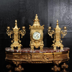 Japy Frères Louis XVI Gilt Bronze Set~ French - Circa 1900 ~ ~~ Excellent condition, fully overhauled ~~ A beautiful, classically designed antique French gilt bronze clock set by Japy Frères. It features oval panels to the sides showing Fortuna, the goddess of luck, an emperor to the front and lions masks. To the top of the clock is a cherub on a globe and flame finials surmount the candelabra. ......Click here for full details! |